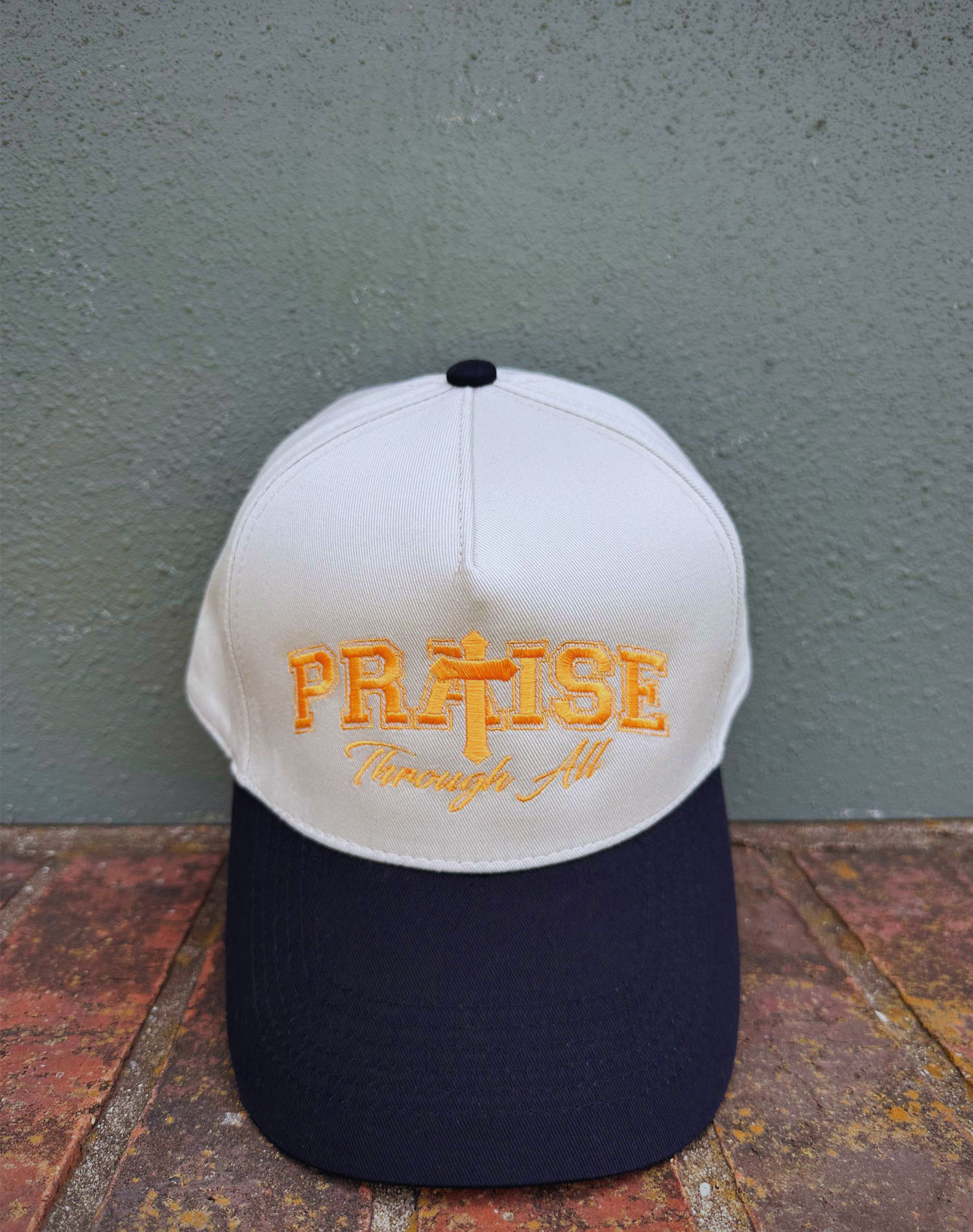 Elevate your faith with this USA-made cap, blending classic style and inspirational design. Featuring bold “PRAISE” typography with a cross symbol, it embodies spirituality and empowerment. Crafted sustainably, this white and navy cap with golden accents is a testament to ethical, faith-driven fashion for every believer.